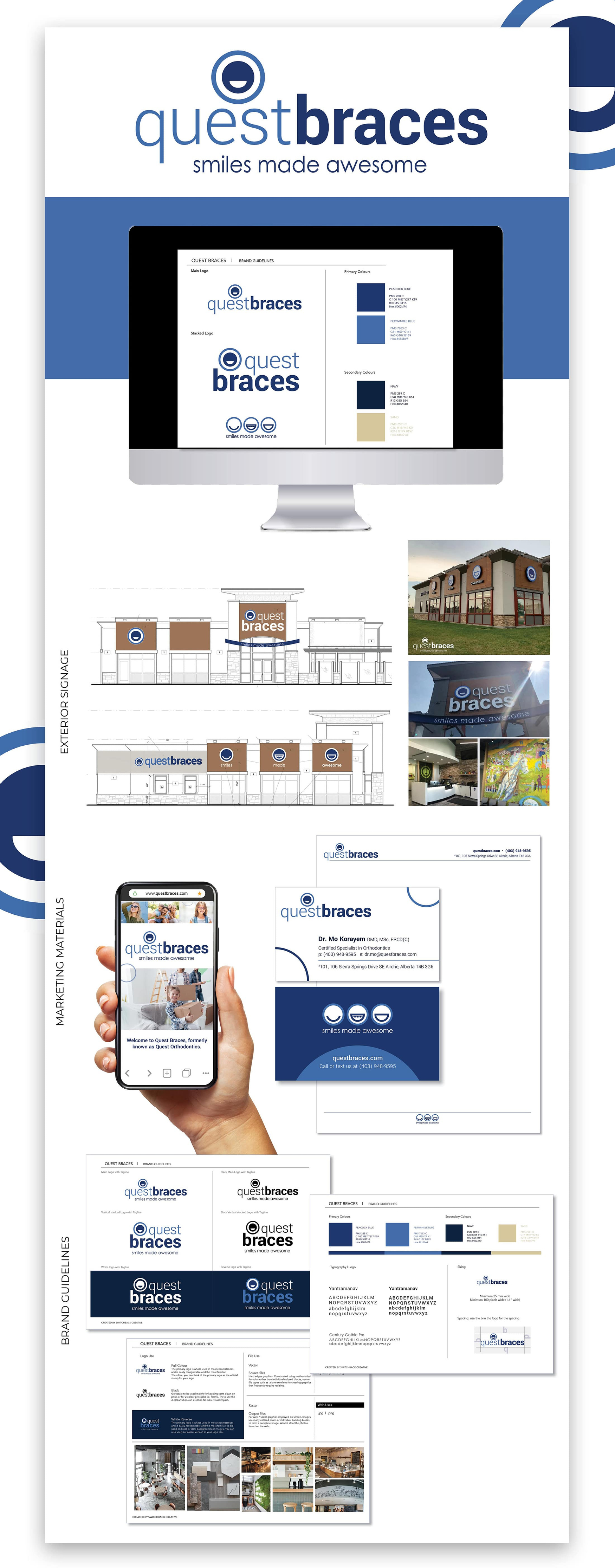 Dr. Mo and the Quest Braces team are long time clients of Switchback, and it was really exciting to help them set the stage for their new office space and business expansion. A name change prompted a new brand development project and all of the juicy goodies that go with it.